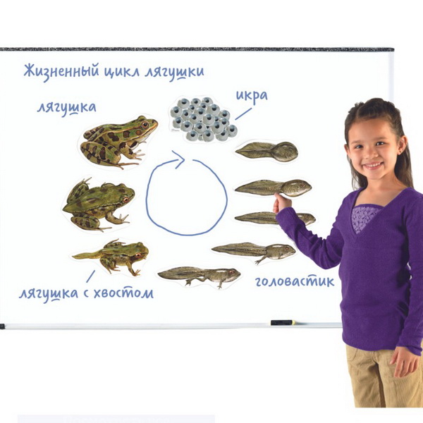 В состав набора входят 9 магнитных детализированных иллюстраций, которые показывают различные этапы жизненного цикла лягушки.