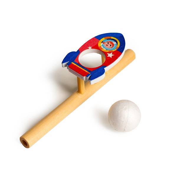 Тренажёр для дыхания выполнен из дерева. Играть с ним легко и просто: нужно положить пенопластовый шарик в отверстие, а затем дунуть со всей силы, чтобы шар подскочил в воздух.