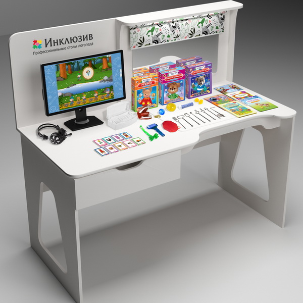 Специализированный стол представляет собой стол с рабочим местом специалиста с интегрированной сенсорной панелью, песочницей и зеркалом с подсветкой и шторкой.