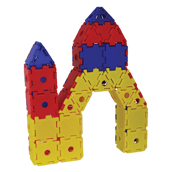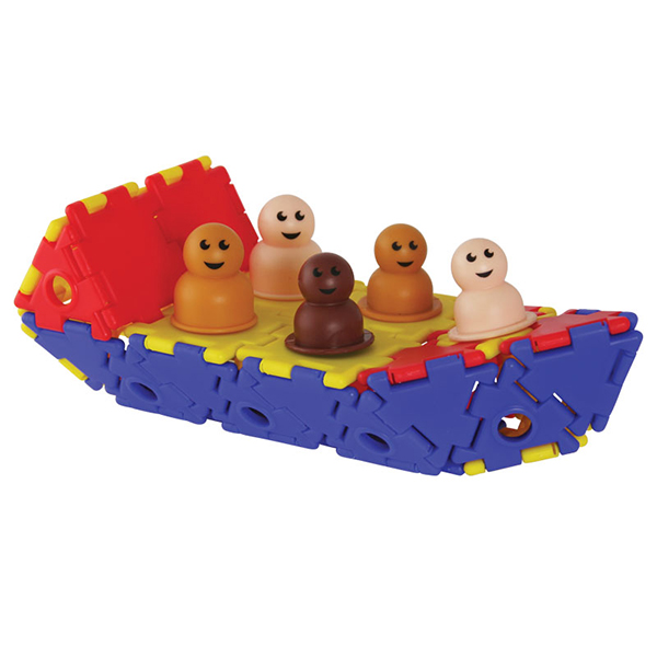 45 треугольников, 45 треугольников с отверстиями, 90 квадратов, 90 квадратов с отверстиями, 36 колец, 12 колёс, 18 осей, 18 детских фигурок и 18 фигурок взрослых.